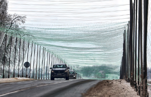 下图:2月2日,乌克兰哈尔科夫州,汽车在覆盖反无人机网的道路上行驶。为防御俄军FPV无人机袭击,当地正在哈尔科夫周边及关键物流路线上架设大型防护网。