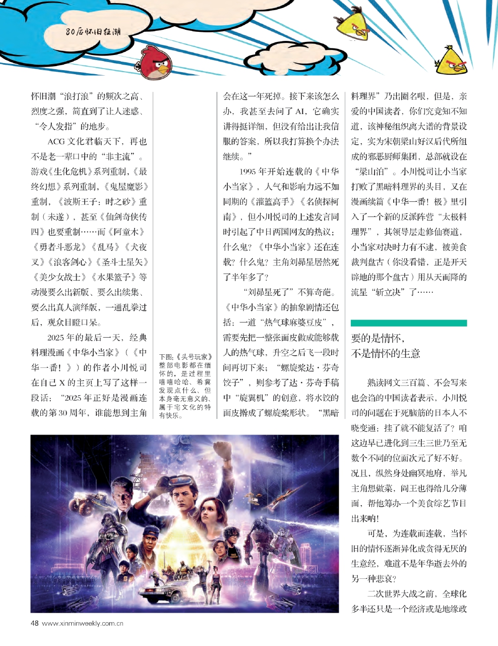 ACG文化君临天下,再也不是老一辈口中的“非主流”。游戏《生化危机》系列重制,《最终幻想》系列重制,《鬼屋魔影》重制,《波斯王子:时之砂》重制(未遂),甚至《仙剑奇侠传四》也要重制……而《阿童木》《勇者斗恶龙》《乱马》《犬夜叉》《浪客剑心》《圣斗士星矢》《美少女战士》《水果篮子》等动漫要么出新版、要么出续集、要么出真人演绎版,一通乱拳过后,观众目瞪口呆。