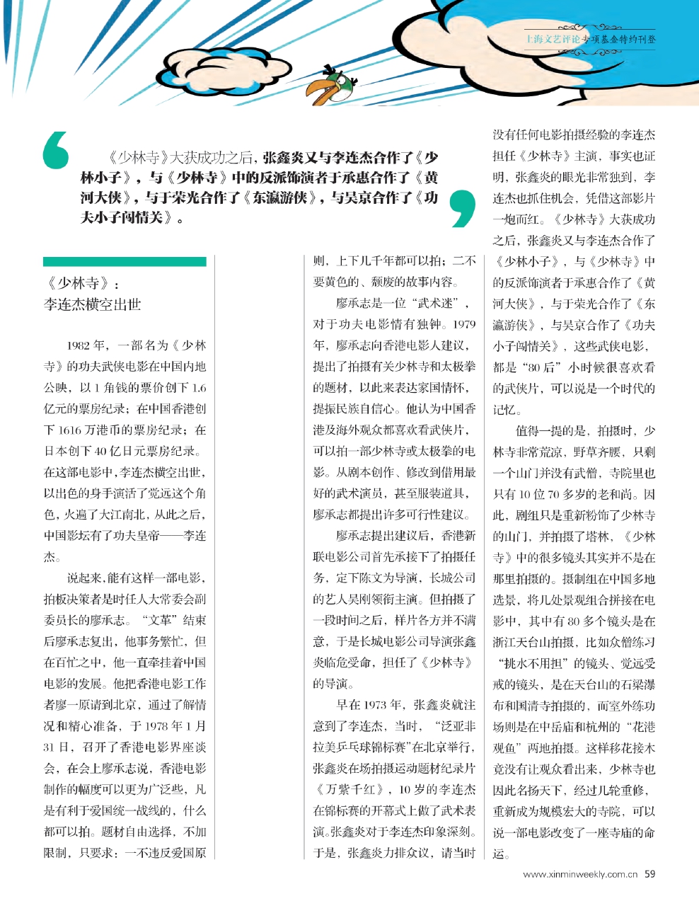 早在1973年,张鑫炎就注意到了李连杰,当时,“泛亚非拉美乒乓球锦标赛”在北京举行,张鑫炎在场拍摄运动题材纪录片《万紫千红》,10岁的李连杰在锦标赛的开幕式上做了武术表演。张鑫炎对于李连杰印象深刻。于是,张鑫炎力排众议,请当时没有任何电影拍摄经验的李连杰担任《少林寺》主演,事实也证明,张鑫炎的眼光非常独到,李连杰也抓住机会,凭借这部影片一炮而红。《少林寺》大获成功之后,张鑫炎又与李连杰合作了《少林小子》,与《少林寺》中的反派饰演者于承惠合作了《黄河大侠》,与于荣光合作了《东瀛游侠》,与吴京合作了《功夫小子闯情关》,这些武侠电影,都是“80后”小时候很喜欢看的武侠片,可以说是一个时代的记忆。