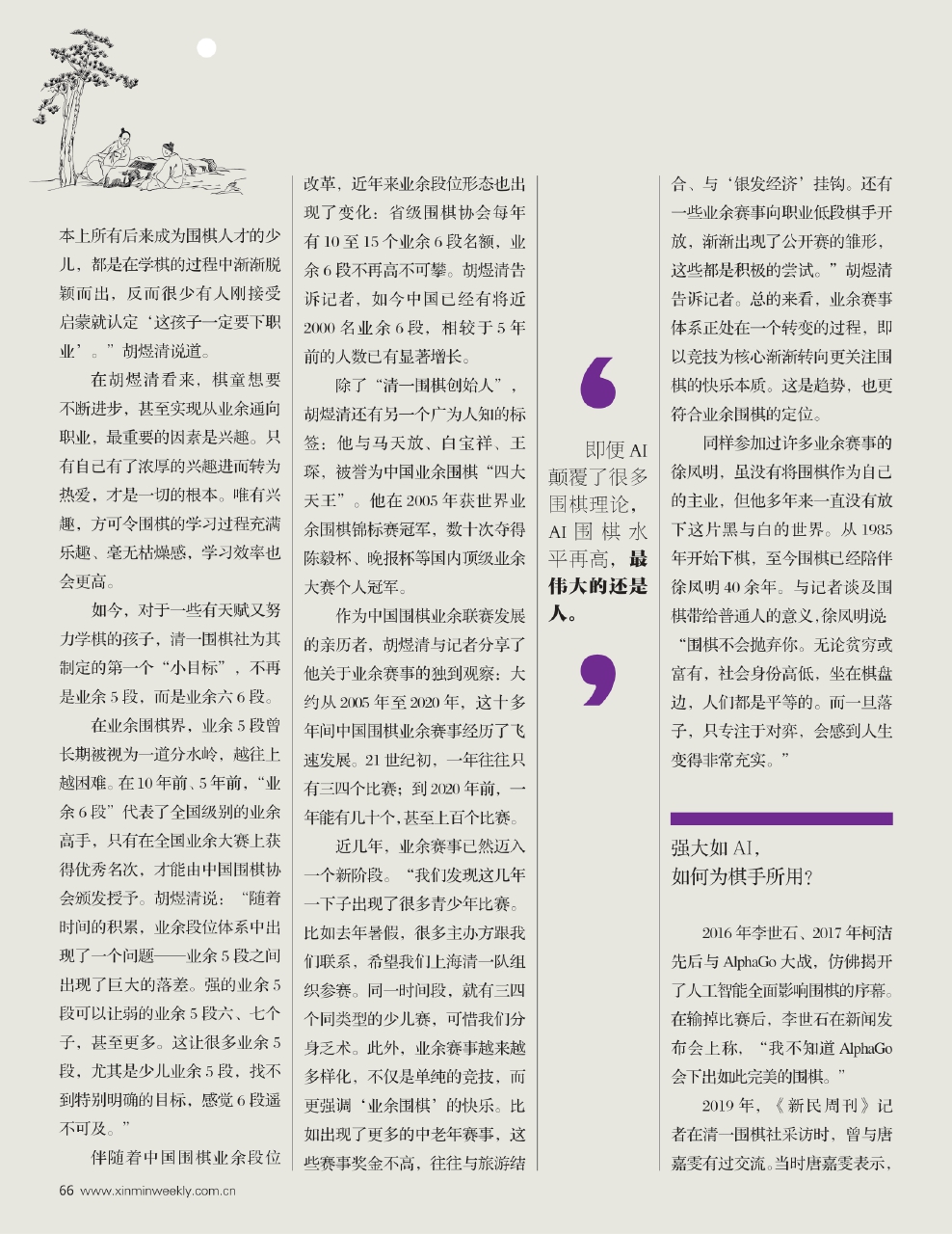 上海清一围棋创始人、上海市围棋协会副秘书长胡煜清近日接受《新民周刊》采访表示,围棋作为一个兼顾竞技、文化、教育、游戏、艺术的智力运动项目,也作为四艺之一,依然为社会大众所认可与推崇。