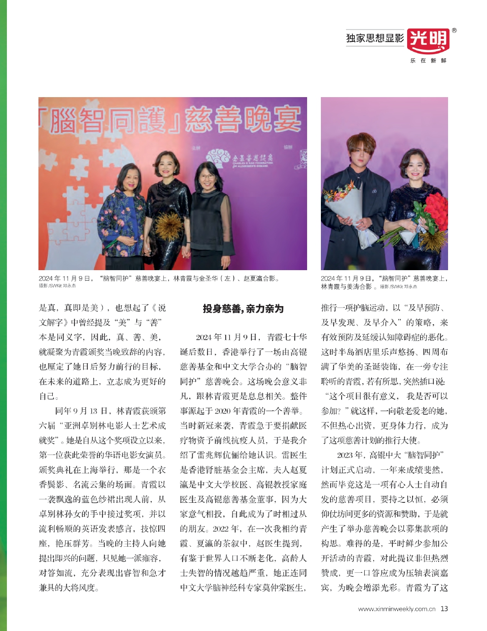 2024年11月9日,青霞七十华诞后数日,香港举行了一场由高锟慈善基金和中文大学合办的“脑智同护”慈善晚会。这场晚会意义非凡,跟林青霞更是息息相关。整件事源起于2020年青霞的一个善举。当时新冠来袭,青霞急于要捐献医疗物资予前线抗疫人员,于是我介绍了雷兆辉伉俪给她认识。雷医生是香港肾脏基金会主席,夫人赵夏瀛是中文大学校医、高锟教授家庭医生及高锟慈善基金董事,因为大家意气相投,自此成为了时相过从的朋友。2022年,在一次我相约青霞、夏瀛的茶叙中,赵医生提到,有鉴于世界人口不断老化,高龄人士失智的情况越趋严重,她正连同中文大学脑神经科专家莫仲棠医生,推行一项护脑运动,以“及早预防、及早发现、及早介入”的策略,来有效预防及延缓认知障碍症的恶化。这时半岛酒店里乐声悠扬、四周布满了华美的圣诞装饰,在一旁专注聆听的青霞,若有所思,突然插口说:“这个项目很有意义,我是否可以参加?”就这样,一向敬老爱老的她,不但热心出资,更身体力行,成为了这项慈善计划的推行大使。