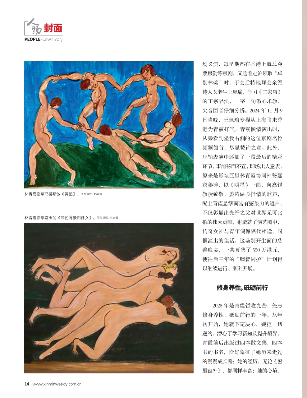 2025年是青霞暂收光芒,矢志修身养性、砥砺前行的一年。从年初开始,她就下定决心,婉拒一切邀约,潜心于学习新知及提升境界。青霞前后出版过四本散文集,四本书的书名,恰好象征了她历来走过的漫漫成长路:她的经历,无论《窗里窗外》,都同样丰富;她的心境,无论《云去云来》,都同样舒坦;她的生活,无论《镜前镜后》,都同样精彩,而这一年,她所努力的方向,就宛如在日常中细尝人生况味,成就了一册趣味隽永的《青霞小品》。