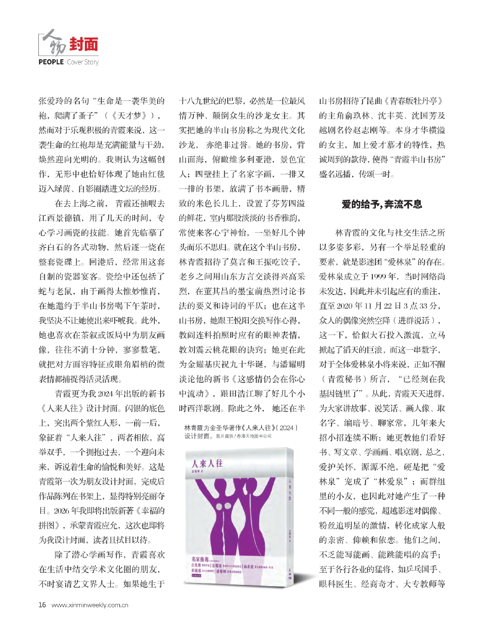 青霞更为我2024年出版的新书《人来人往》设计封面。闪银的底色上,突出两个紫红人形,一前一后,象征着“人来人往”,两者相依,高举双手,一个拥抱过去,一个迎向未来,诉说着生命的愉悦和美好。这是青霞第一次为朋友设计封面,完成后作品陈列在书架上,显得特别亮丽夺目。2026年我即将出版新著《幸福的拼图》,承蒙青霞应允,这次也即将为我设计封面,读者且拭目以待。