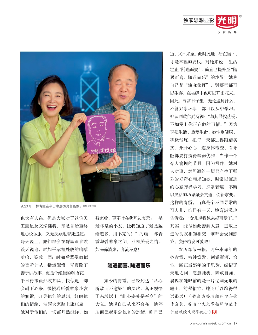 如今的青霞,已经到达“从心所欲而不逾矩”的层次,真正领悟了东坡居士“此心安处是吾乡”的含义。她说自己从来不会在一地停居而泛起系念他乡的愁绪,昨日已逝、来日未至,此时此地,活在当下,才是幸福的要诀。对她来说,生活岂止“随遇而安”,简直已提升至“随遇而喜、随遇而乐”的境界!她称自己是“油麻菜籽”,到哪里都可以生存,在夹缝中也可以开出花来。因此,寻常日子里,无论遇到什么,不管好事坏事,都可以从中学习。她认同黄仁勋所说:“与其寻找热爱,不如爱上你正在做的事情。”因为享受生活、热爱生命,她注重健康、积极锻炼,把每一天都过得踏踏实实、开开心心,连身体检查、看牙医都要打扮得端丽优雅,当作一个令人愉悦的节目。因为写作,她对人对事,对周遭的一切都产生了强烈的好奇心和求知欲,时常以谦逊的心态跨界学习,探索新境;不断以灵活的巧思融会贯通、创新求变。这样的青霞,当真是个不同寻常的可人儿,难怪有一天,她喜滋滋地告诉我:“女儿说我越来越可爱了。”其实,能与如此善解人意、进取上进的良友相知相交,谁都会受到感染,变得越发可爱吧!
