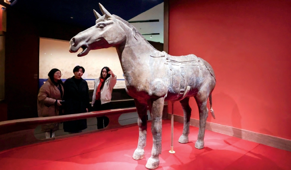 2026年1月31日,北京,观众在观看“跃马扬鞭——马年新春文化展”上的秦鞍马俑。