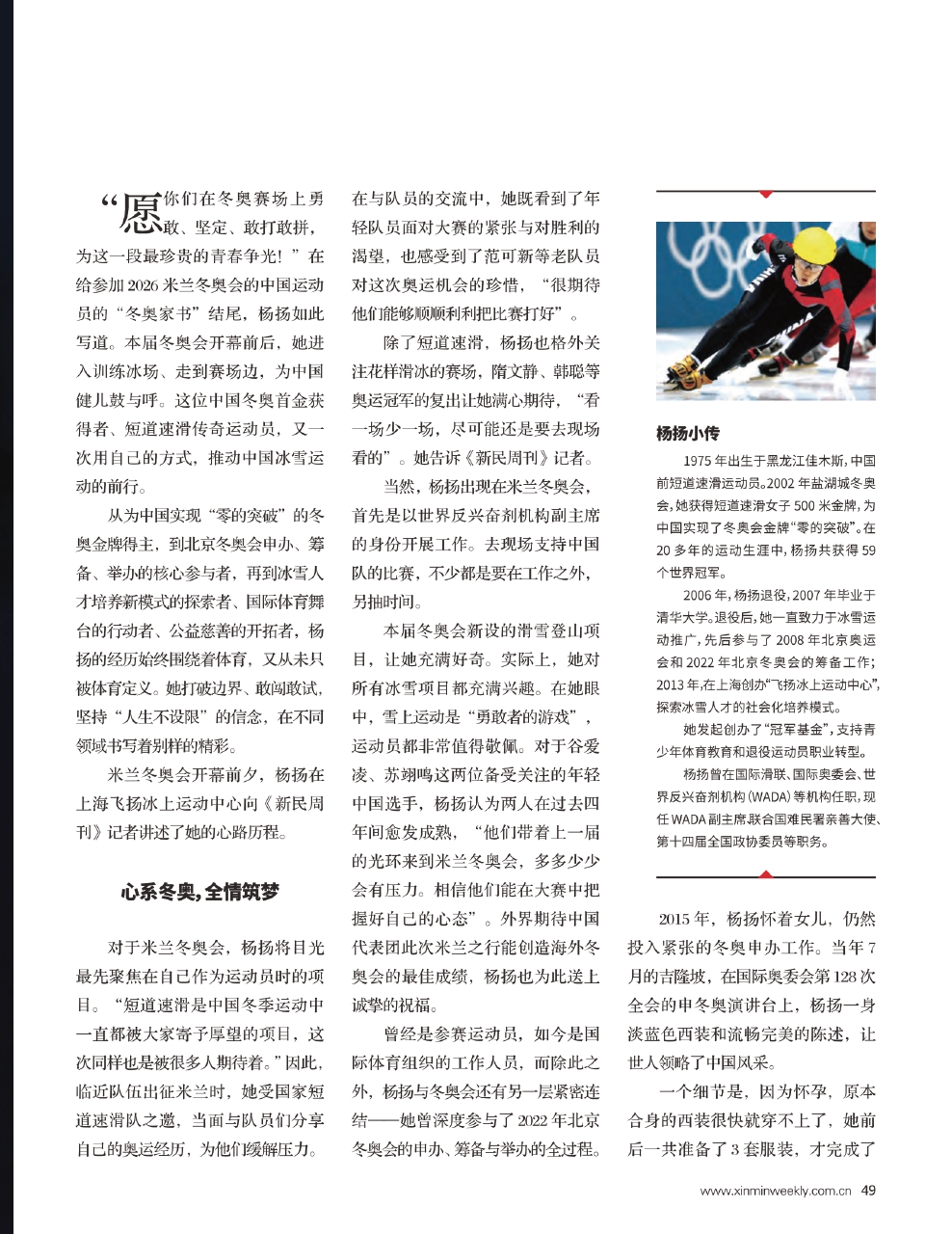 米兰冬奥会开幕前夕,杨扬在上海飞扬冰上运动中心向《新民周刊》记者讲述了她的心路历程。