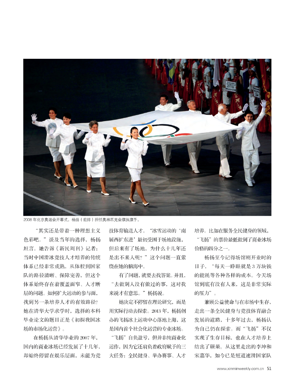 2008年北京奥运会开幕式,杨扬(前排)担任奥林匹克会旗执旗手。