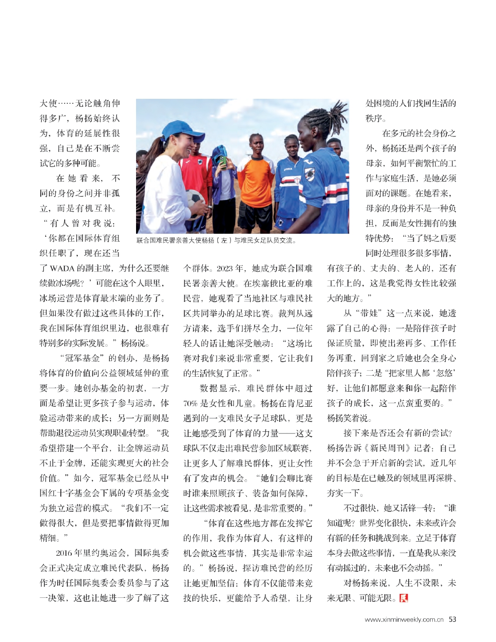 2016年里约奥运会,国际奥委会正式决定成立难民代表队,杨扬作为时任国际奥委会委员参与了这一决策,这也让她进一步了解了这个群体。2023年,她成为联合国难民署亲善大使。在埃塞俄比亚的难民营,她观看了当地社区与难民社区共同举办的足球比赛。裁判从远方请来,选手们拼尽全力,一位年轻人的话让她深受触动:“这场比赛对我们来说非常重要,它让我们的生活恢复了正常。”