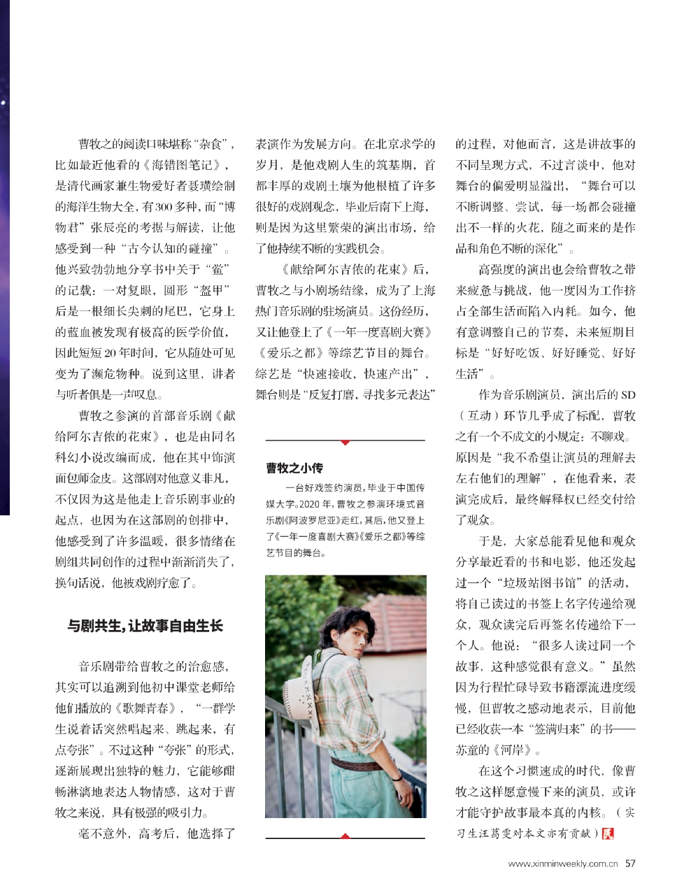 曹牧之参演的首部音乐剧《献给阿尔吉侬的花束》,也是由同名科幻小说改编而成,他在其中饰演面包师金皮。这部剧对他意义非凡,不仅因为这是他走上音乐剧事业的起点,也因为在这部剧的创排中,他感受到了许多温暖,很多情绪在剧组共同创作的过程中渐渐消失了,换句话说,他被戏剧疗愈了。