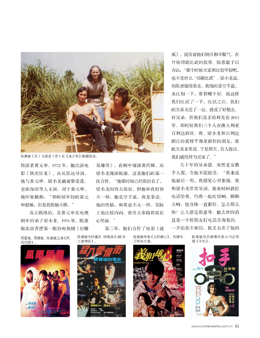 李小龙、成龙、狄龙和梁小龙并称香港“四小龙”,陈惠敏和他们四个人都合作过。尤其是梁小龙,几十年的兄弟情,这关系非同一般。