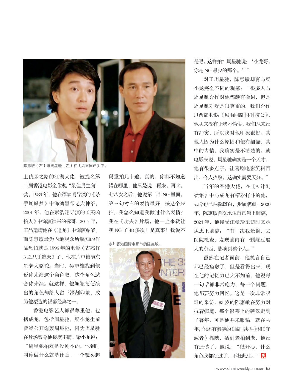 当年的香港大佬,在《A计划续集》中与成龙有精彩打斗的他,如今也已两鬓斑白,步履蹒跚。2020年,陈惠敏首次承认自己患上肺癌,2024年,他接受汪曼玲采访时又承认患上脑癌:“有一次我晕倒,去医院检查,发现脑内有一颗绿豆般大的东西,影响到整个人。”