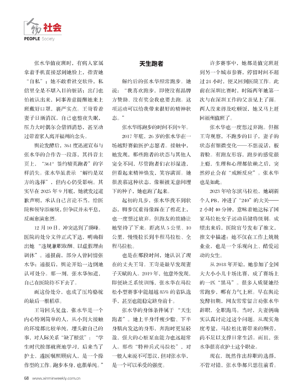 王岢回头复盘,张水华是一个内心特别简单的人,从小到大接触的环境都比较单纯,埋头做自己的事,对人际关系“缺了根弦”:“学生时代按部就班地学习,后来当了护士,遵医嘱照顾病人,是一个操作型的工作。跑步本身,也很单纯。”