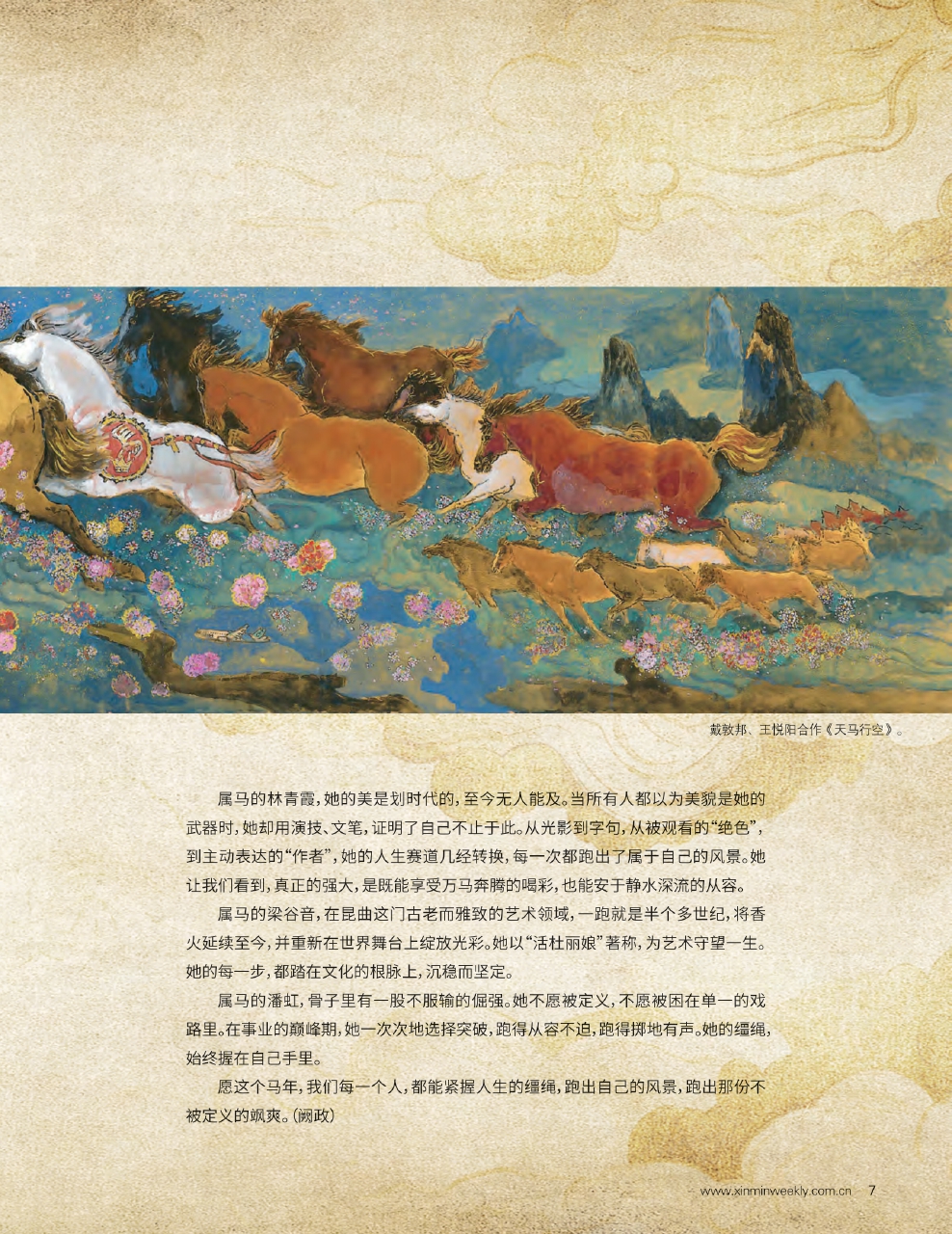 属马的林青霞,她的美是划时代的,至今无人能及。当所有人都以为美貌是她的武器时,她却用演技、文笔,证明了自己不止于此。从光影到字句,从被观看的“绝色”,到主动表达的“作者”,她的人生赛道几经转换,每一次都跑出了属于自己的风景。她让我们看到,真正的强大,是既能享受万马奔腾的喝彩,也能安于静水深流的从容。属马的梁谷音,在昆曲这门古老而雅致的艺术领域,一跑就是半个多世纪,将香火延续至今,并重新在世界舞台上绽放光彩。她以“活杜丽娘”著称,为艺术守望一生。她的每一步,都踏在文化的根脉上,沉稳而坚定。