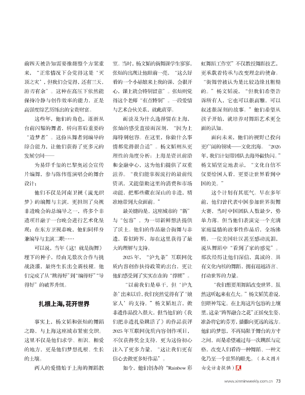 “我们想要用舞蹈改变世界,虽然这听起来有点大。”杨文韬笑着说,但眼神笃定。在上海这片包容的土壤里,这朵“跨界融合之花”正摇曳生姿,准备将它的芬芳,播撒向更远的远方。他们的梦想,不再局限于舞台的方寸之间,而是希望通过每一次跳跃与定格,改变人们看待一种舞蹈、一种文化乃至一个世界的眼光。(本文图片由受访者提供)