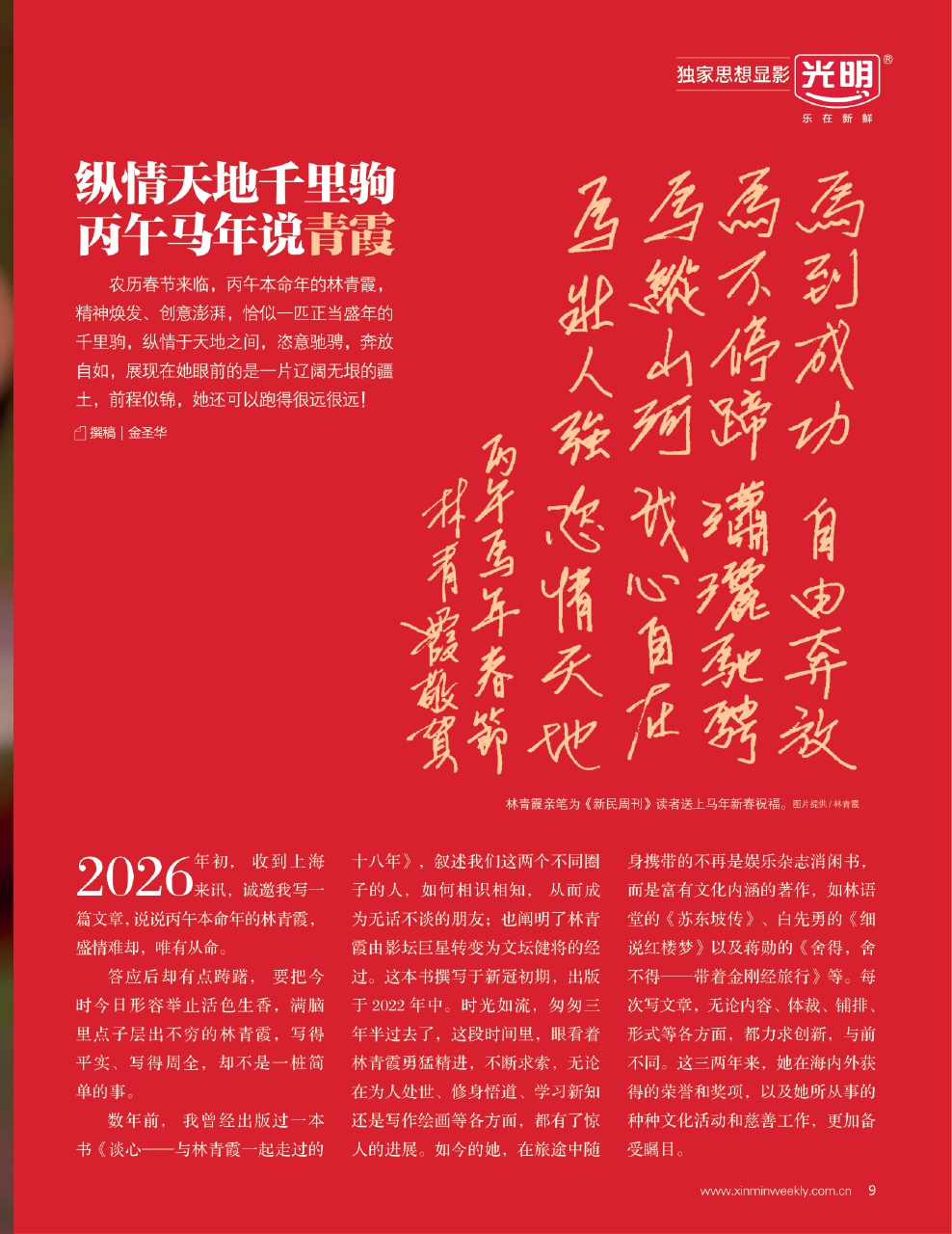 农历春节来临,丙午本命年的林青霞,精神焕发、创意澎湃,恰似一匹正当盛年的千里驹,纵情于天地之间,恣意驰骋,奔放自如,展现在她眼前的是一片辽阔无垠的疆土,前程似锦,她还可以跑得很远很远!(作者为香港翻译学会荣休会长、香港中文大学翻译学荣休讲座教授及荣誉院士)