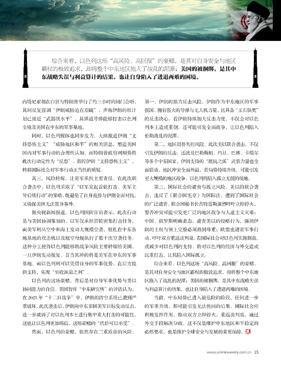 综合来看,以色列这场“高风险、高回报”的豪赌,是其对自身安全与地区霸权的极致追求,却将整个中东地区拖入了战乱的泥潭;美国的被捆绑,是其中东战略失误与利益算计的结果,也让自身陷入了进退两难的困境。