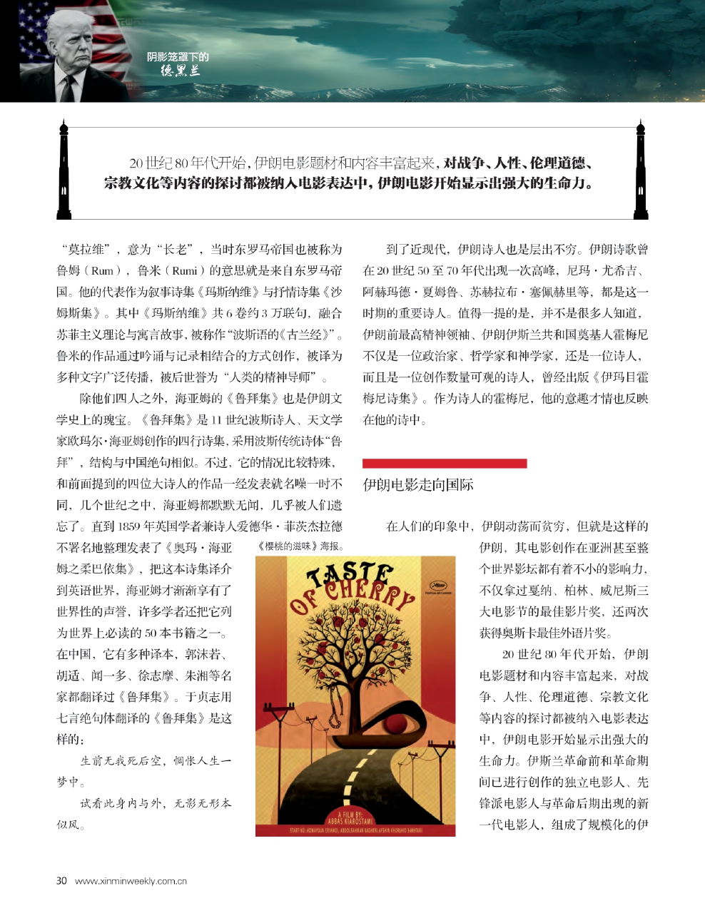 到了现代,伊朗电影又在世界影坛异军突起,影迷熟悉的《一次别离》《推销员》《出租车》《樱桃的滋味》《小鞋子》等电影,掀起了一股伊朗电影的旋风,成为世界影坛不可忽视的力量。诗歌与光影,带我们进入不一样的伊朗。