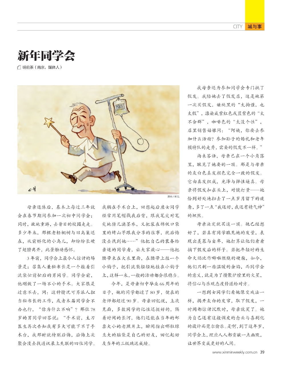 一想到女同学们看她像变戏法一样,揭开灰白的发帘,取下假发,一时间都惊讶沉默时,母亲就笑了。她为自己还有这般调皮的念头与喜剧化的设计而莞尔偷乐。是啊,到了这年岁,同学会上,理应人人都贡献一点幽默,让世界变成更好的人间。