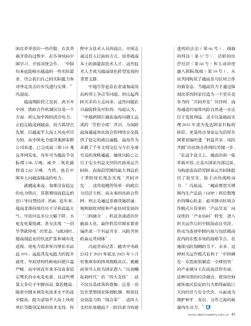 中越尽管也存在着诸如南海岛屿领土争议等问题,但比起两国关系的大走向来,这些问题在目前阶段是可控的。冯超认为,“中越两国目前在南海问题上达成的‘管控分歧’共识,为保障南海通道和丝路合作网络安全提供了稳定的政治前提。南海作为承载了千年文明交往与今日全球贸易的战略通道,地缘风险已让位于安全利益交织的丝路命运共同体,南海沿岸国的最大利益在于秉持绿色理念实现‘共同开发’,这将超越传统单一的政治与经济主权。而未来的丝路合作网,则正是通过基础设施联通、规则制度对接和产业协同发展的‘三网融合’,将这条通道的价值最大化,最终将沿岸国家紧密编织成一个利益共享、风险共担的命运共同体”。