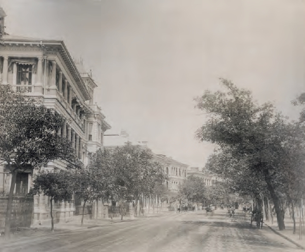 上图:19世纪80年代拍摄的上海外滩,道路右边的建筑是海关验船所。