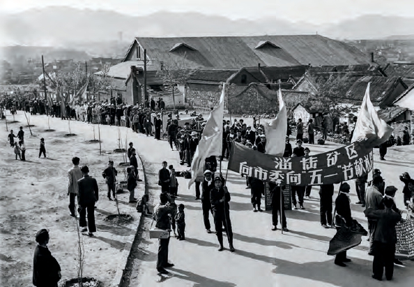 上图:1959年5月1日,淄博市举行盛大集会,庆祝“五·一”国际劳动节。淄博矿区献礼队伍通过市区,经博山人民剧场前往淄博文化宫献礼馆。摄影/王乃高