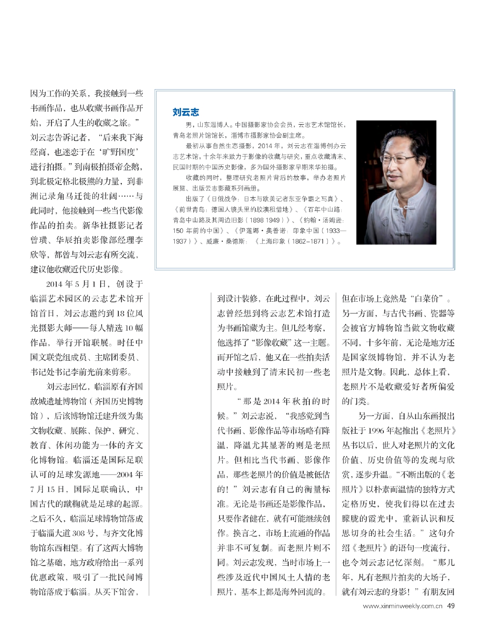 最初从事自然生态摄影,2014年,刘云志在淄博创办云志艺术馆,十余年来致力于影像的收藏与研究,重点收藏清末、民国时期的中国历史影像,多为国外摄影家早期来华拍摄。