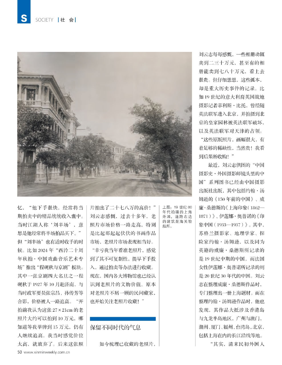 刘云志收藏的不少老照片系从海外回流中国。他认为,这些照片弥足珍贵。也正因此,他通过包括拍卖在内的不同渠道得到这些老照片以后,收藏于云志艺术馆以及后来创办的青岛老照片馆。“起码在我有生之年,我只收藏这些老照片,而并不会在这些老照片升值以后,转手再上拍场将它们卖了。我不是为了牟利,而是为了通过老照片收藏,来保留不同时代的气息。”刘云志说。他欣喜地发现,近五六年以来,属于国家文博系统的一些博物馆等也开始注重老照片的收藏了。“这说明老照片的价值得到了社会层面、国家层面的认可。”刘云志说。