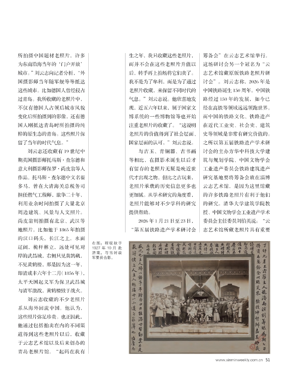 2026年1月21日至23日,“第五届铁路遗产学术研讨会筹备会”在云志艺术馆举行。这场研讨会另一个冠名为“云志艺术馆藏原版铁路老照片研讨会”。刘云志称,2026年是中国铁路诞生150周年。中国铁路经过150年的发展,如今已经在高铁等领域远远领跑世界。而中国的铁路文化、铁路遗产在近代工业史、社会史、建筑史等领域是非常有研究价值的。之所以第五届铁路遗产学术研讨会的主办方华中科技大学建筑与规划学院、中国文物学会工业遗产委员会铁路建筑遗产研究基地要将筹备会放在淄博云志艺术馆,是因为这里馆藏的许多铁路老照片有利于他们的研究。清华大学建筑学院教授、中国文物学会工业遗产学术委员会主任委员刘伯英说:“云志艺术馆所藏老照片具有重要的史料与研究价值。以一批铁路题材老照片而论——这批史料的公开与解读,将为铁路遗产学科建设与发展注入新的活力。”哈尔滨工业大学建筑与设计学院教授、第四届铁路遗产国际会议执行主席赵志庆则说:“云志艺术馆所藏不少影像资料是早期铁路建设社会图景与工程实况的记录,为铁路遗产研究提供了不可多得的视觉实证。”
