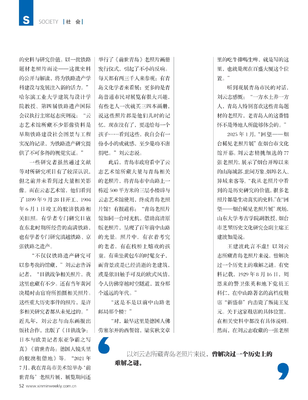 “不仅仅铁路遗产研究可以参考我的馆藏,”刘云志告诉记者,“日俄战争相关照片,我这里也藏有不少。还有当年黄河决堤时由官府所拍摄相关照片。这些重大历史事件的照片,是许多相关研究者都从未见过的。”近几年,刘云志与山东画报出版社合作,出版了《日俄战争:日本与欧美记者东亚争霸之写真》《前世青岛:德国人镜头里的胶澳租借地》等。“2021年7月,我在青岛市美术馆举办‘前世青岛’老照片展,展览期间还举行了《前世青岛》老照片画册发行仪式,引起了不小的反响。每天都有两三千人来参观:有青岛文化学者来看展;更多的是青岛普通市民对展览有很大兴趣,有些老人一次就买三四本画册,说这些照片都是他们儿时的记忆,现在没有了,要送给每一个孩子……看到这些,我自会有一份小小的成就感,至少是功不唐捐吧。”刘云志说。