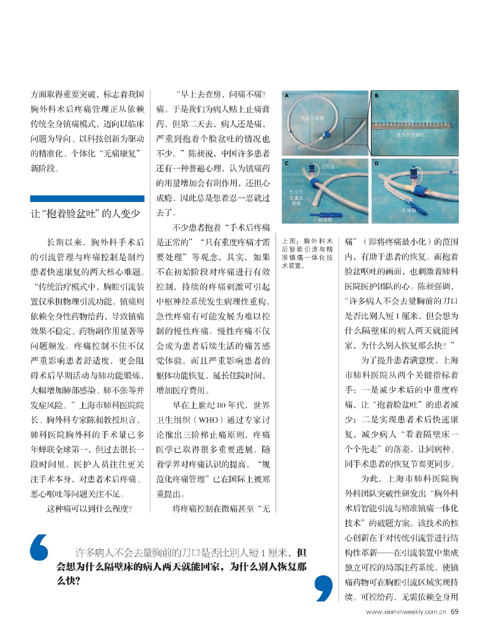 “疼痛不仅是身体上的折磨,更会影响术后恢复,甚至让一些患者因恐惧而推迟必要的手术。”王晨告诉《新民周刊》,“肺科医院从去年开始,在胸外科领域率先关注疼痛管理这一课题,就是为了令医疗技术的进步真正惠及患者”。