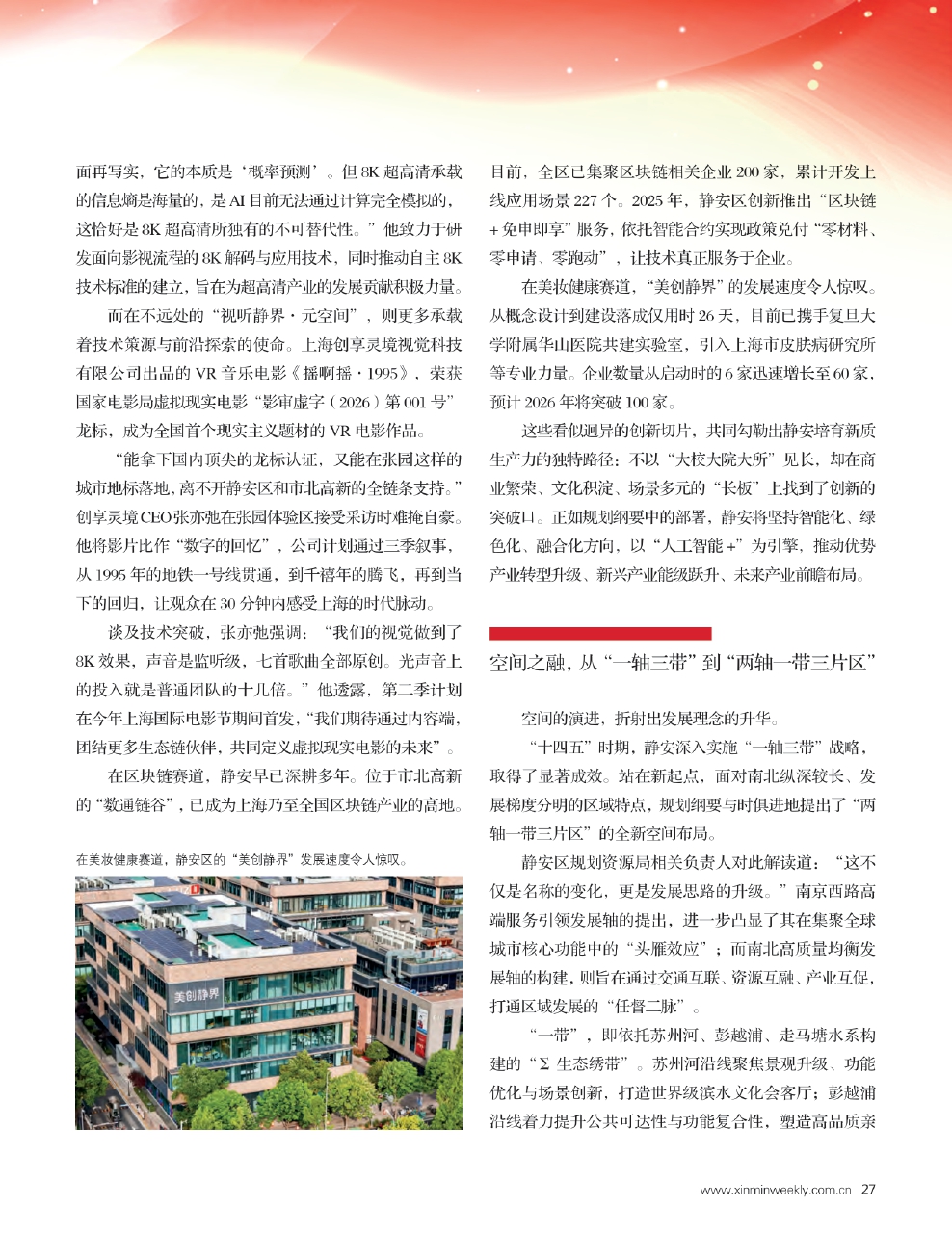 这一布局的深层逻辑,在张亦弛的亲身经历中得到了印证:“我们是‘南北互通’最典型的例子——企业注册在市北高新,研发孵化在北部,作品却落地在南部的张园。市北园区不仅帮我们对接了张园的优质场景资源,还协助解决了线下体验的技术适配、客流引导、合规审批等关键问题,让‘虚拟体验引流、实体消费转化’的商业闭环在短短数月内快速跑通。活动开放期间,每天有大量游客慕名而来,体验结束后还会在张园的餐饮、零售商户消费,这种文化、科技与商业的深度融合,让VR电影真正走进大众生活,也让老建筑焕发新活力。”
