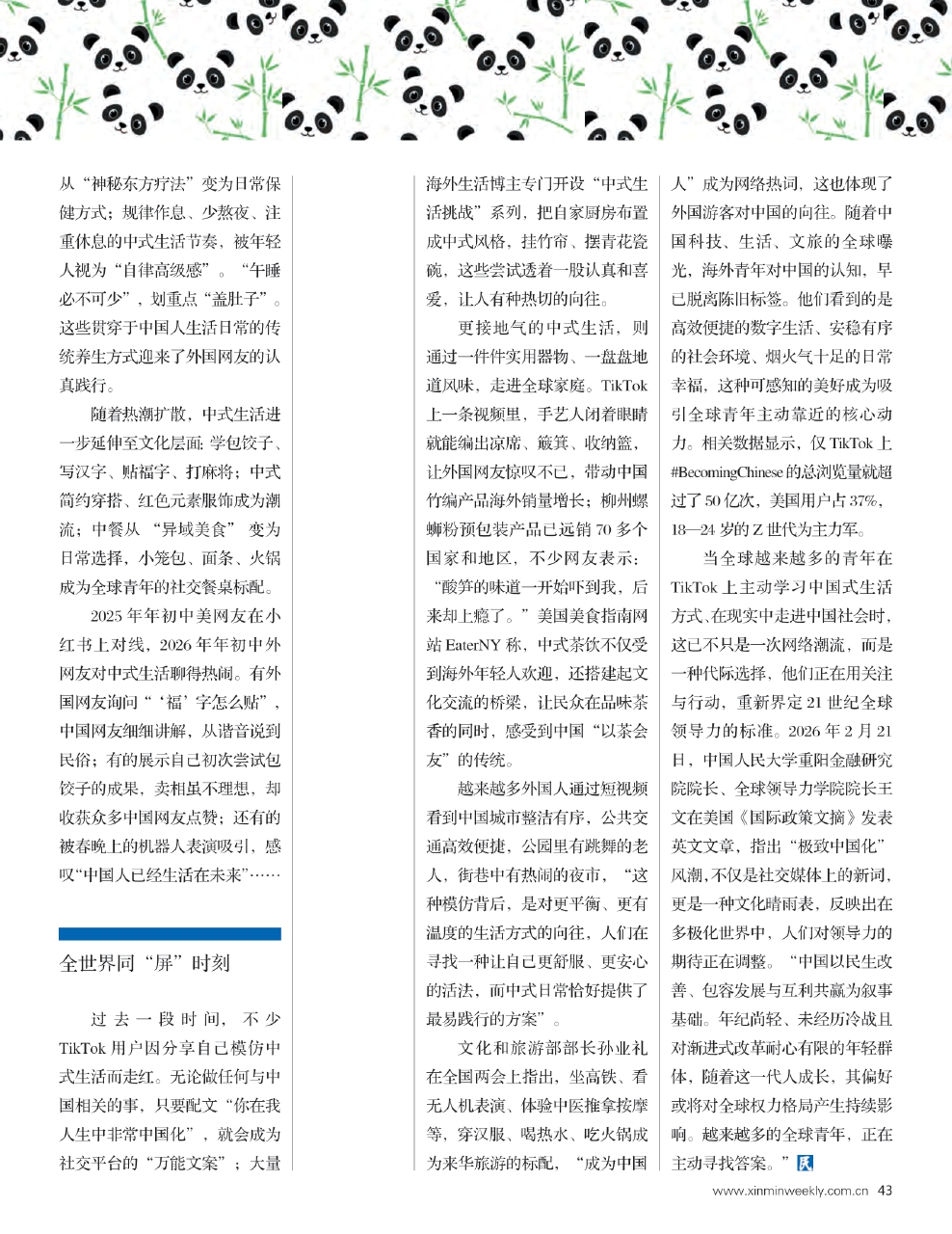 当全球越来越多的青年在TikTok上主动学习中国式生活方式、在现实中走进中国社会时,这已不只是一次网络潮流,而是一种代际选择,他们正在用关注与行动,重新界定21世纪全球领导力的标准。2026年2月21日,中国人民大学重阳金融研究院院长、全球领导力学院院长王文在美国《国际政策文摘》发表英文文章,指出“极致中国化”风潮,不仅是社交媒体上的新词,更是一种文化晴雨表,反映出在多极化世界中,人们对领导力的期待正在调整。“中国以民生改善、包容发展与互利共赢为叙事基础。年纪尚轻、未经历冷战且对渐进式改革耐心有限的年轻群体,随着这一代人成长,其偏好或将对全球权力格局产生持续影响。越来越多的全球青年,正在主动寻找答案。”