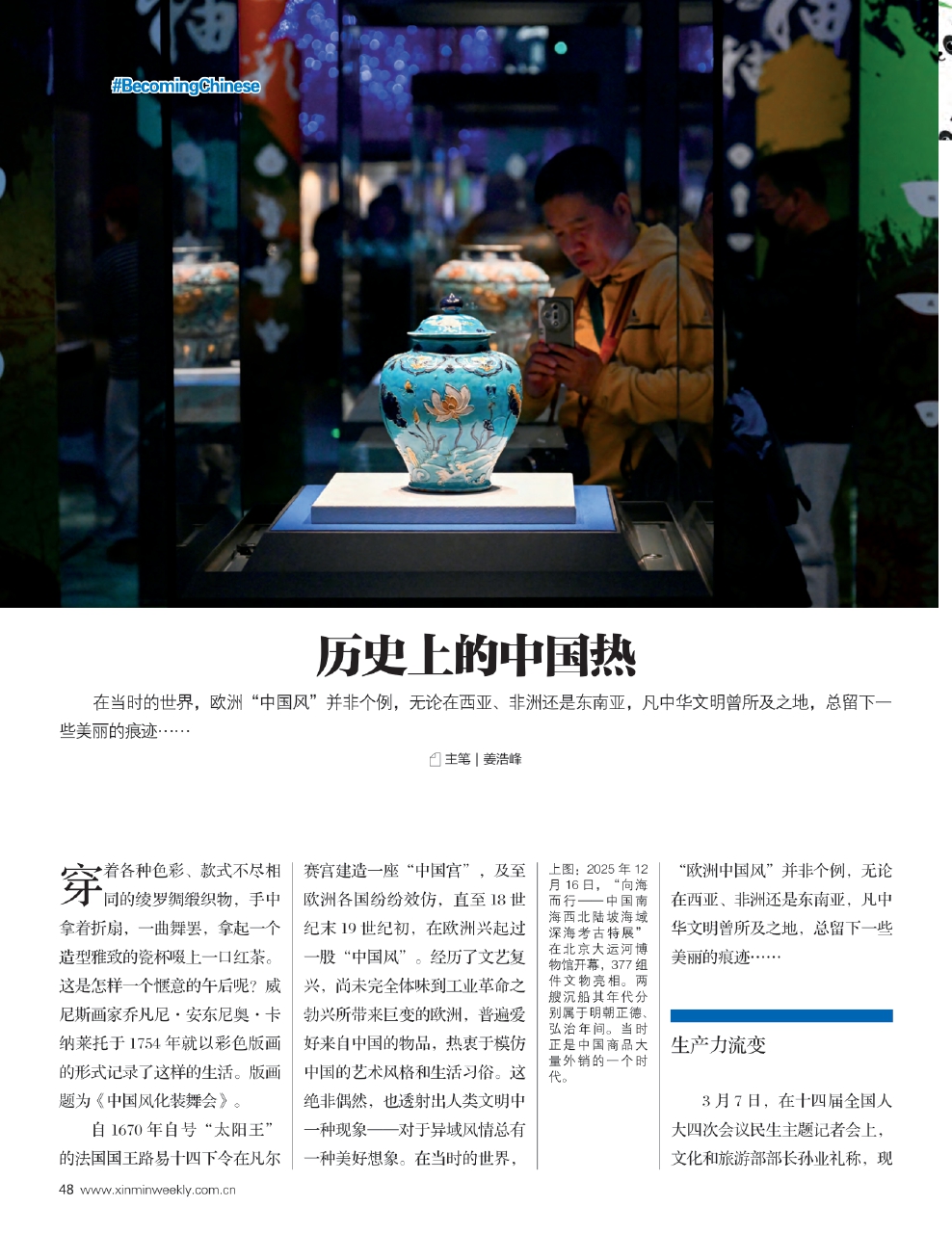 然而,随着中国国力日隆,越来越多中国游客走出国门且显示出富有活力的购买力,渐渐地,中国人的生活方式再次成为欧美一些人所崇尚的时尚。湘潭大学哲学与历史文化学院教授刘自强曾在《中国社会科学报》发表文章称,之所以15世纪末16世纪初欧洲催生出一股前所未有的“中国热”,主要有两方面原因。其一,在于随着新航路的开辟,东西方海道大通,西班牙、葡萄牙殖民者从拉美掠夺了大量的黄金和白银,当然,与此同时,地处亚欧大陆东西两端的中国与欧洲之间的交往、交流越来越多。其二,则是中国生产的商品、发明的技术以及儒学经典等大量流入欧洲。“从当时中、欧生产力水平来看,此时中国的生产能力占优势。中国生产的商品价廉物美,在国际市场上具有很强的竞争能力。16—18世纪,中国向全世界出口商品有236种之多,其中手工业品有137种。而同期欧洲国家由于“价格革命”冲击,加之战乱、瘟疫和灾荒流行,经济日益萧条,拿不出像样的产品销往中国市场,只好携带白银来中国采购货物到欧洲销售。”刘自强分析道。