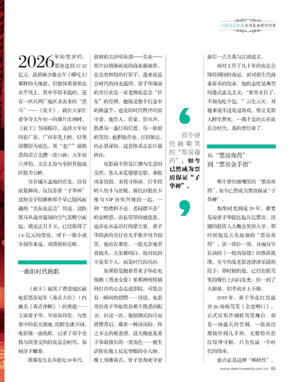 在导演、影评人魏君子看来,《夜王》看似是春节档的异类——讲夜总会、舞女、老千局,实则是一部披着“枕头片”外衣的正统职场励志喜剧。它承袭了80年代麦当雄的社会写实血脉,接驳了2000年后《金鸡》的励志基因,最终用王家卫的窥探感+王晶的商业算计,烹出了一锅属于2026年的香港“人情味”。