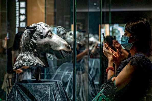 上图:2022年,“盛世回归——海外回流文物特展”在闵行区博物馆开展,展出了清代圆明园海晏堂十二生肖之牛首、虎首、猴首、猪首、马首等五件青铜兽首,吸引市民前来参展。