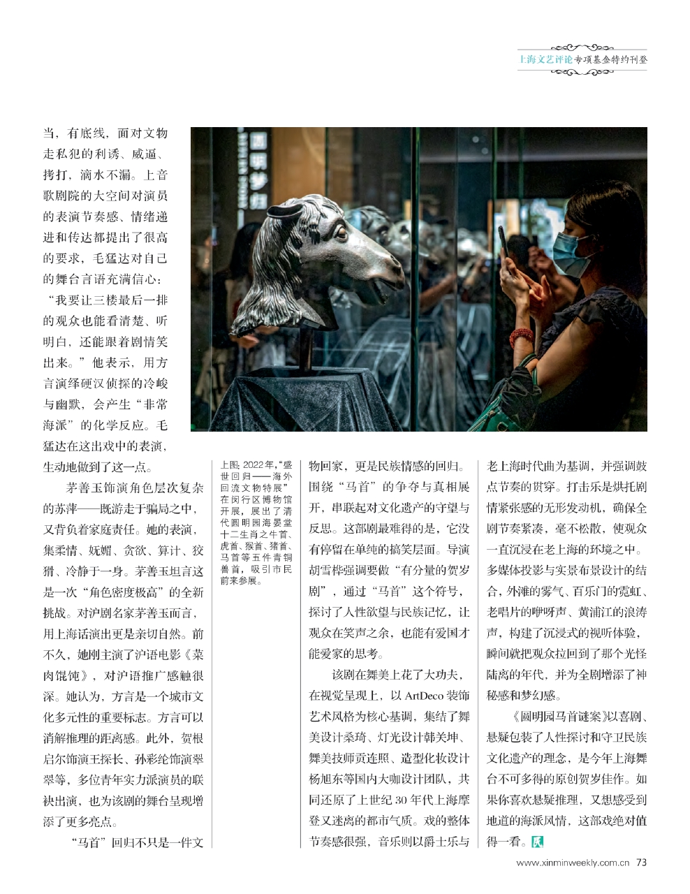 《圆明园马首谜案》以喜剧、悬疑包装了人性探讨和守卫民族文化遗产的理念,是今年上海舞台不可多得的原创贺岁佳作。如果你喜欢悬疑推理,又想感受到地道的海派风情,这部戏绝对值得一看。