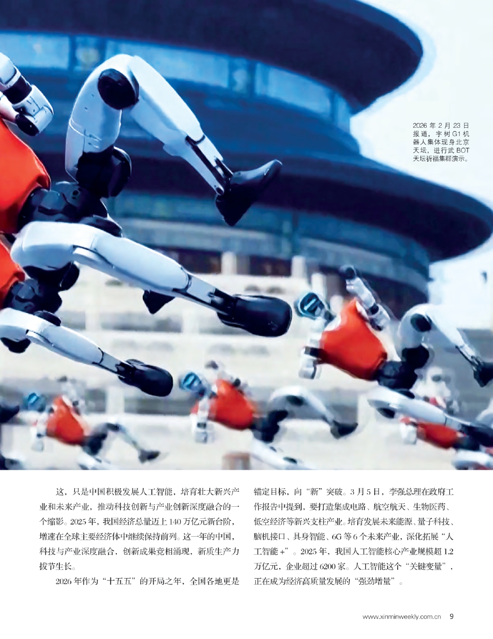 一年之计在于春。从1月底至2月初,全国各省(区、市)先后密集进入“两会时间”。会场内外,“科技创新”成为高频议题。及至2月16日的央视春晚,宇树科技、松延动力、魔法原子、银河通用等公司的多款机器人集中“炫技”。武术表演《武BOT》,更是彻底引爆了全球亿万观众的热情。身着练功服的人形机器人作为最引人注目和最精彩的表演者之一,其出色的舞台表现和运动能力令人惊叹不已。
