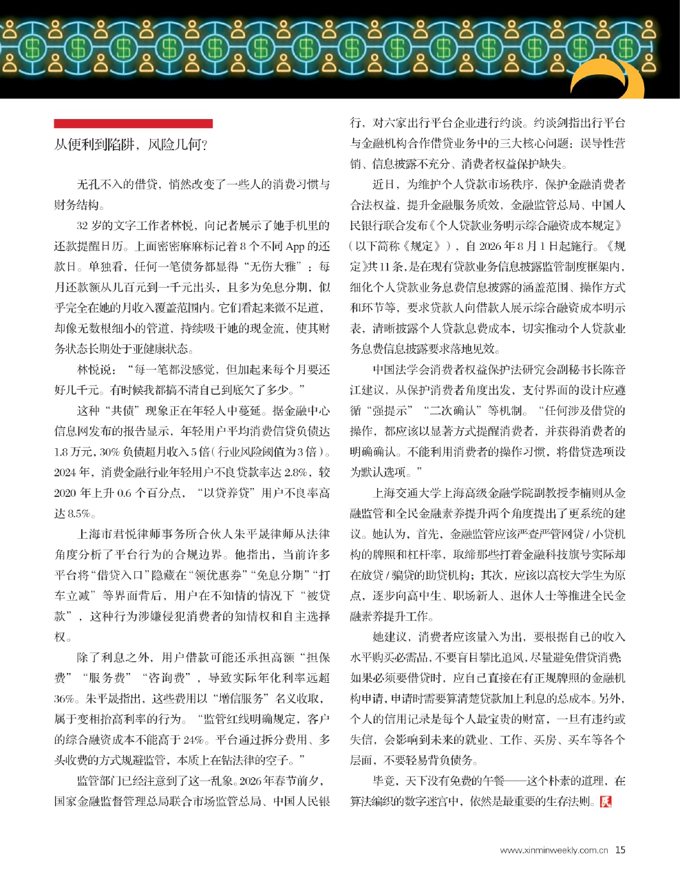 这种“深度场景化”的金融理念,在实践中是否导致了过度营销和诱导借贷?上海交通大学上海高级金融学院副教授李楠在接受《新民周刊》采访时表示,这种以用户需求为核心的理念应用于支付服务并无问题,但是作为贷款营销的理念却问题很大。在实际操作中,部分平台利用算法推送、限时优惠、弹窗诱导等方式,制造紧迫感和虚假需求,并进一步诱导用户非理性借贷。
