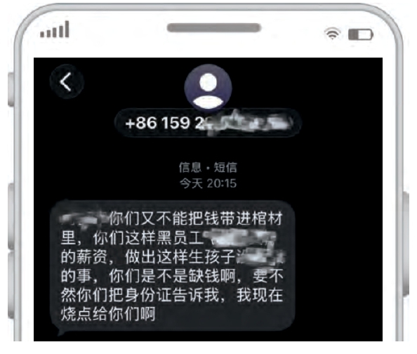 就是在这样的情况下,她仍然遭受了“暴力催收”。“我欠款逾期是我做得不对,平台采取任何正规的催收措施,我都认可。因为我没有及时还清欠款,他们要走法律途径起诉我、让我成为失信人都可以,但是发那些辱骂和恐吓信息给我的公司领导和同事,这就是在把我逼到绝路。”