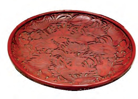 辽博馆藏永乐朝经典之作,以黄漆为地,满髹朱红漆层,盘心精雕荷塘双鸳图景。盘底髹黑漆,左侧刻竖排单行“大明永乐年制”款。