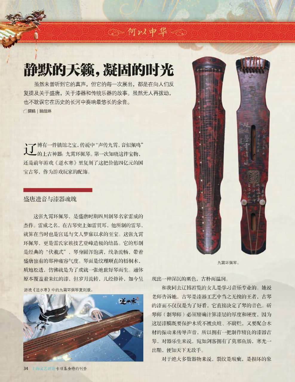 辽博有一件镇馆之宝,传说中“声传九霄,音似佩鸣”的上古神器:九霄环佩琴。第一次知晓这件宝物,还是前年游戏《逆水寒》里复刻了这把价值四亿元的国宝古琴,作为游戏玩家的配饰。