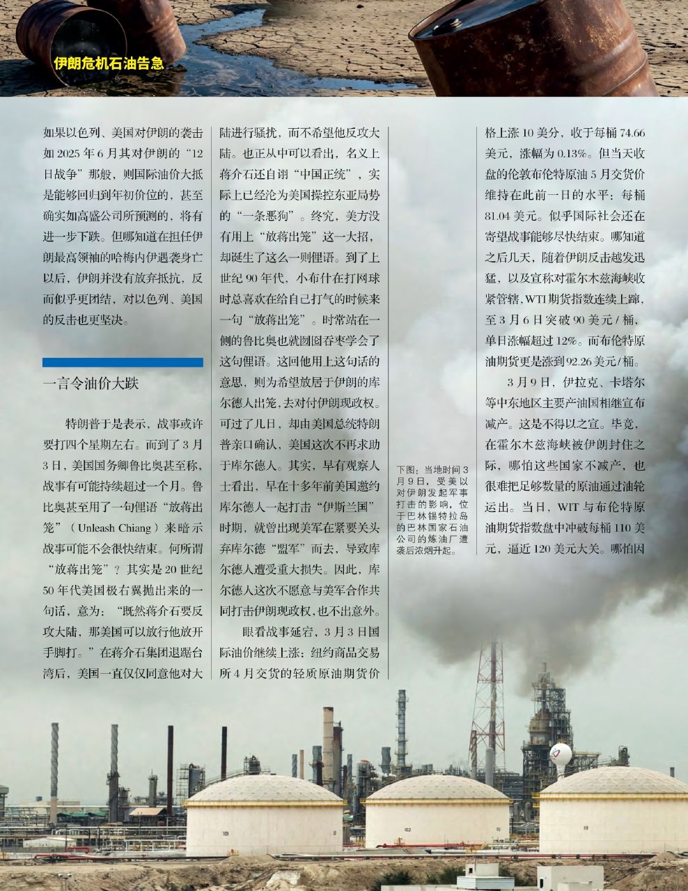回看2月28日开始以色列、美国对伊朗的进攻,以及伊朗的反击,所造成的国际油价变化,先是飙涨,后又曾发生剧烈波动。北京时间3月2日7时,原油期货市场开盘时,国际油价曾一下子飙升13%,纽约商品交易所4月交货的WTI原油跃升至75.33美元/桶,洲际交易所5月交货的伦敦布伦特原油站上82美元/桶高位。之后,两油大幅高开后涨幅有所收窄。从这一天的原油期货行情看,市场似乎从战端方启时的恐慌中有所冷静。原因在于当时美国总统特朗普放话称,战事最快可能两三天就结束了。原本,在战事开启之前,高盛公司刚发布宏观商品研报。其中称,布伦特和WTI原油价格将于2026年第四季度触底,分别跌到60美元/桶与56美元/桶。摩根大通则预计布伦特原油今年均价将为每桶58美元,WIT原油均价为每桶54美元。如果以色列、美国对伊朗的袭击如2025年6月其对伊朗的“12日战争”那般,则国际油价大抵是能够回归到年初价位的,甚至确实如高盛公司所预测的,将有进一步下跌。但哪知道在担任伊朗最高领袖的哈梅内伊遇袭身亡以后,伊朗并没有放弃抵抗,反而似乎更团结,对以色列、美国的反击也更坚决。