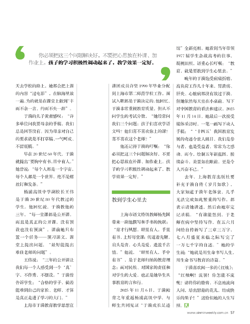 他还记得于漪的叮嘱:“你必须把这三个问题解决好,不要把心思放在补课、加作业上。孩子的学习积极性调动起来了,教学效果一定好。”