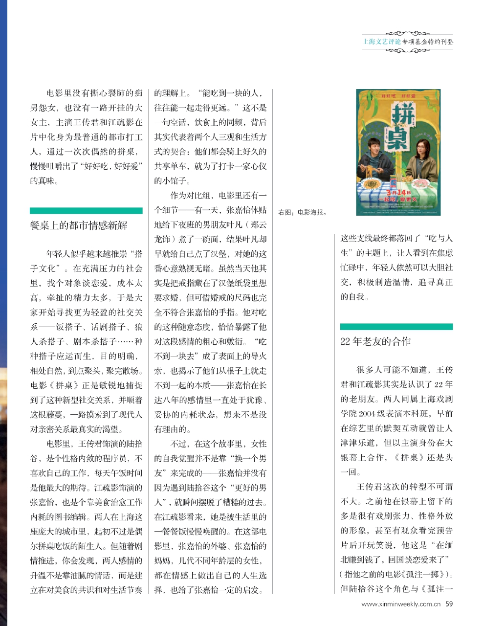 电影里没有撕心裂肺的痴男怨女,也没有一路开挂的大女主,主演王传君和江疏影在片中化身为最普通的都市打工人,通过一次次偶然的拼桌,慢慢咀嚼出了“好好吃,好好爱”的真味。