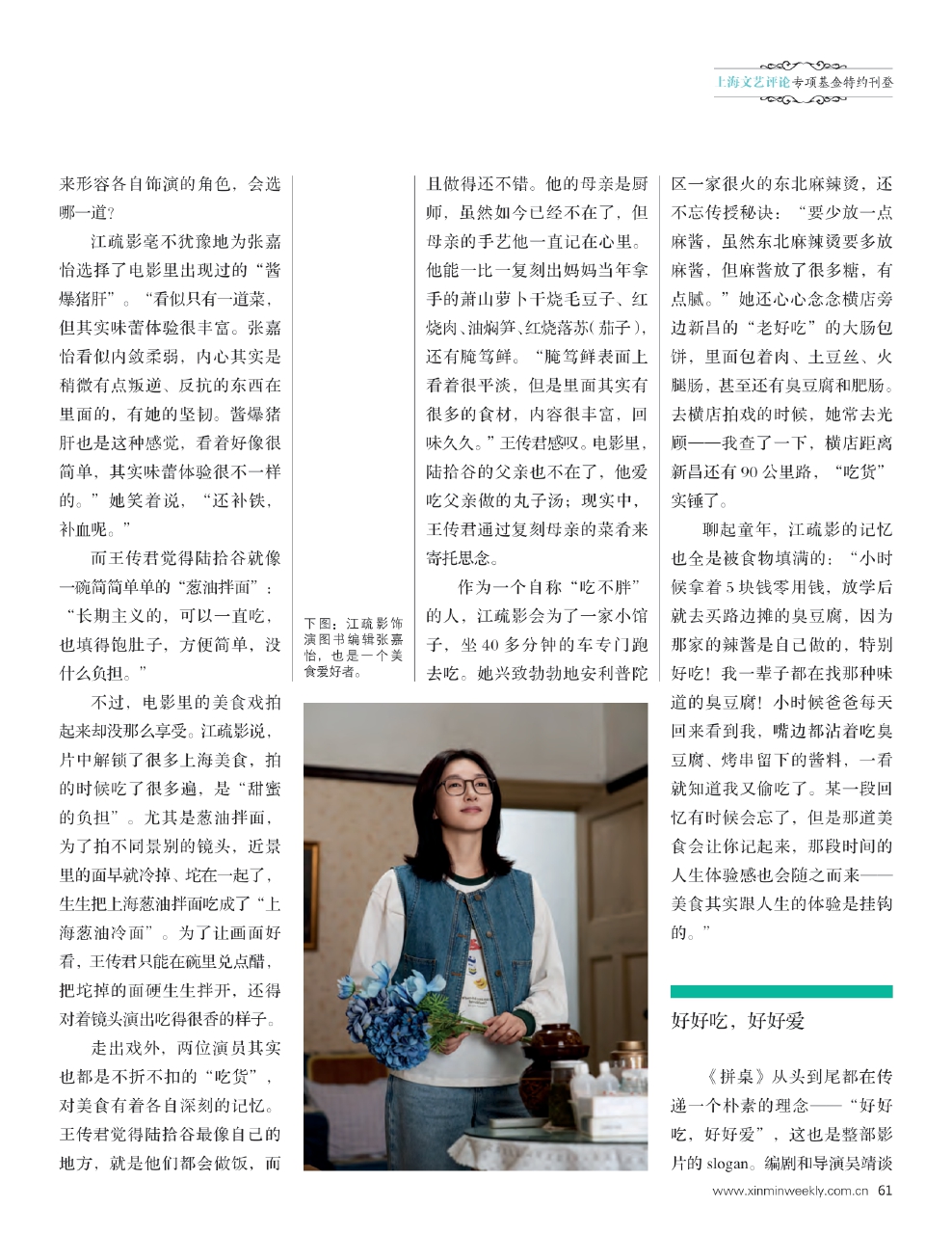 江疏影毫不犹豫地为张嘉怡选择了电影里出现过的“酱爆猪肝”。“看似只有一道菜,但其实味蕾体验很丰富。张嘉怡看似内敛柔弱,内心其实是稍微有点叛逆、反抗的东西在里面的,有她的坚韧。酱爆猪肝也是这种感觉,看着好像很简单,其实味蕾体验很不一样的。”她笑着说,“还补铁,补血呢。”