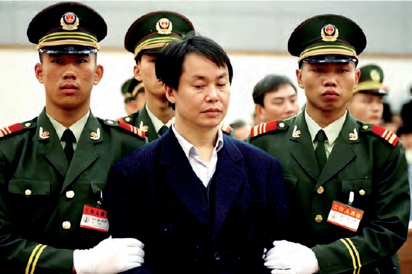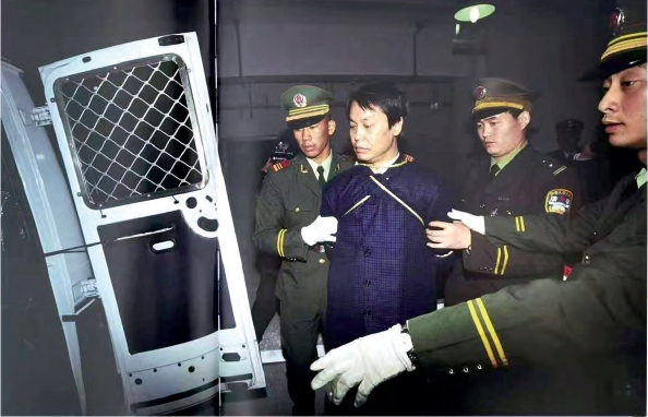 审判完后,张子强被法警、武警押上囚车执行死刑。摄影/周晓晖