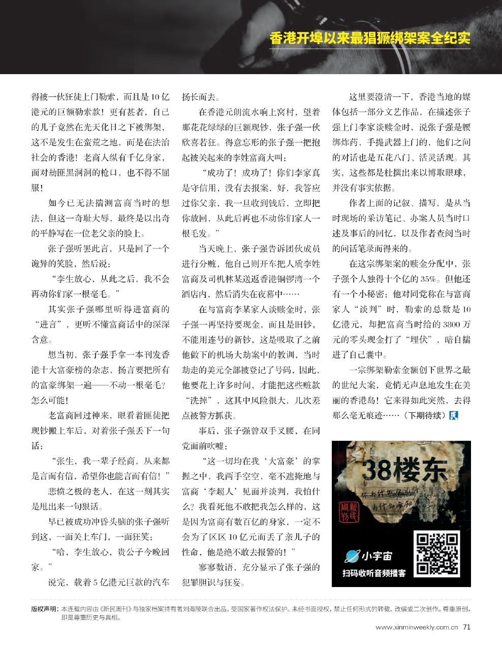 为权威、深度还原这段历史,本刊自本期起,独家连载长期追踪此案的羊城晚报高级记者刘海陵撰写的纪实作品。作为广东新闻界资深的政法记者,刘海陵长年从事公安政法题材的报道,亲历社会治安一线,见证了改革开放以来广东社会治安由乱到治的全过程,先后采访过张子强团伙案、番禺大劫案、“东星”轮案、南海警匪枪战、海盗案、“9601”毒品案等等震惊全国的大案。他以宏阔的视角、翔实的资料与冷静的笔触,首次系统性地揭示了张子强犯罪集团从滋生、猖獗到被彻底铲除的全过程,生动记录了粤港两地警方携手雷霆打击犯罪、捍卫法律尊严的卓越历程。