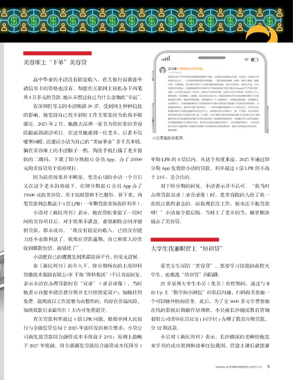 小洁和小李的遭遇并不是个案。年轻人对人生充满期待,愿意通过“投资自己”来打开成长空间。殊不知,他们在网上的每一次搜索或是每一次“关注”,已经成为算法的依据,算法精准推送为年轻人精心包装的“消费贷”,让他们在不提风险只提收益的美好谎言中迷失,最终让他们一步步沦为“数字肥羊”。