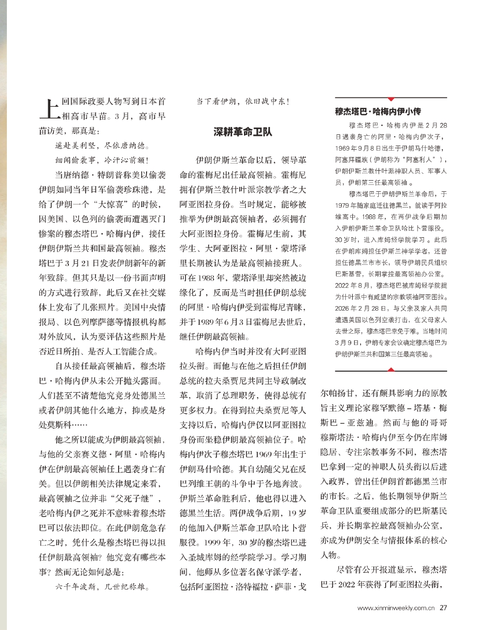 自穆杰塔巴·哈梅内伊成为伊朗最高领袖之后,截至《新民周刊》记者发稿,他并没有在公开场合露面,只由他的个人社交平台多次发布个人照片。其中部分照片还是过去与人合影的旧照经过裁剪才放出来的。因此,特朗普曾公开质疑穆杰塔巴是否还在人世。