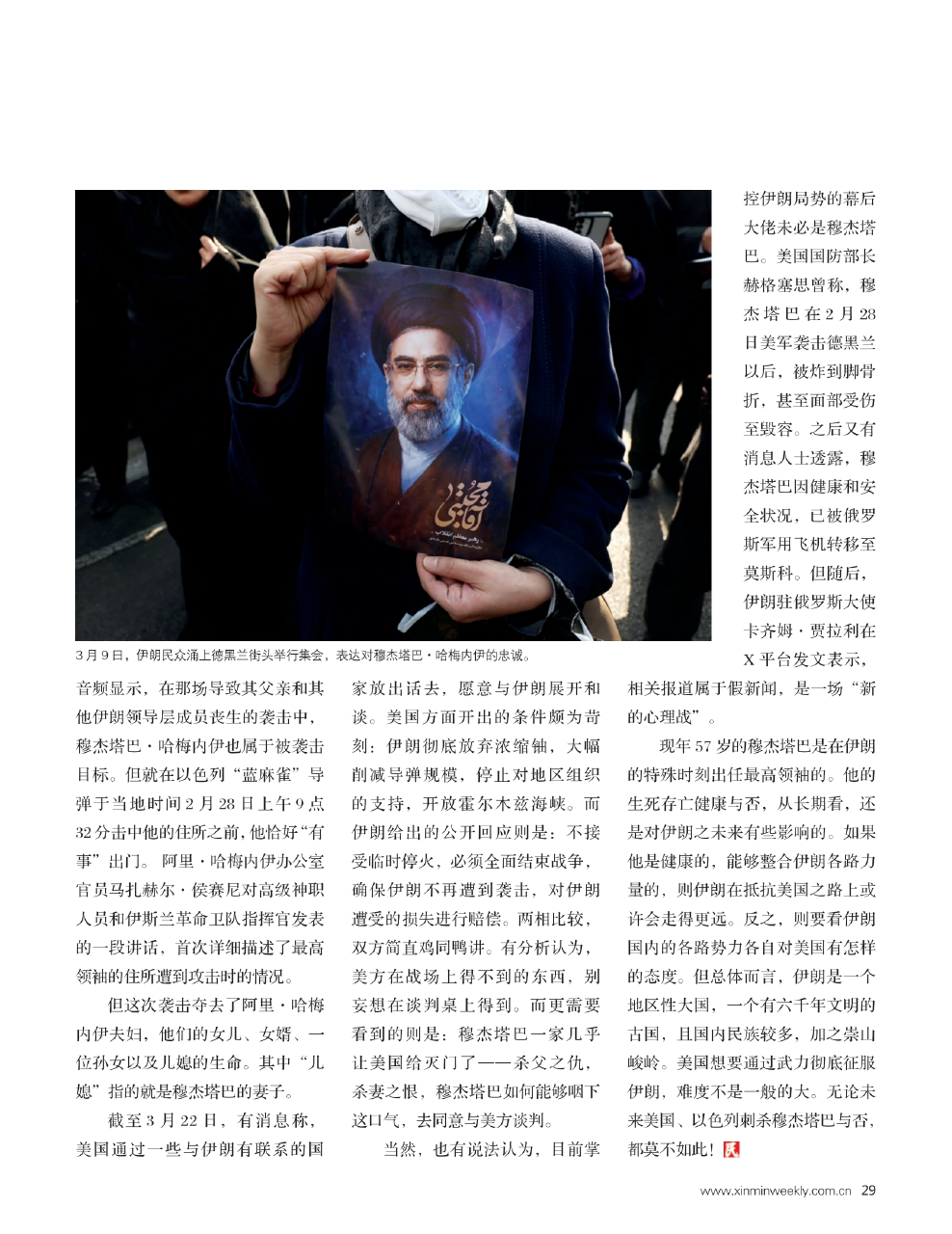 自穆杰塔巴·哈梅内伊成为伊朗最高领袖之后,截至《新民周刊》记者发稿,他并没有在公开场合露面,只由他的个人社交平台多次发布个人照片。其中部分照片还是过去与人合影的旧照经过裁剪才放出来的。因此,特朗普曾公开质疑穆杰塔巴是否还在人世。